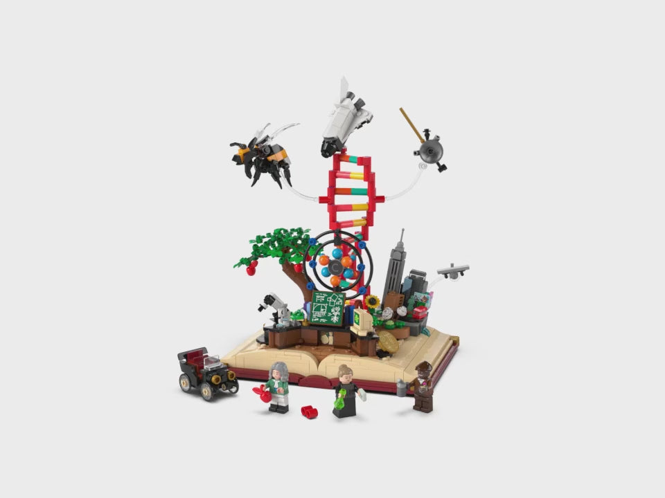 - Maqueta de exposición coleccionable para adultos: Una base construible en forma de libro abierto de la que brotan numerosos minimodelos, como el manzano de Newton, el lecho de plantas de Carver, una lanzadera espacial y un brazo robótico