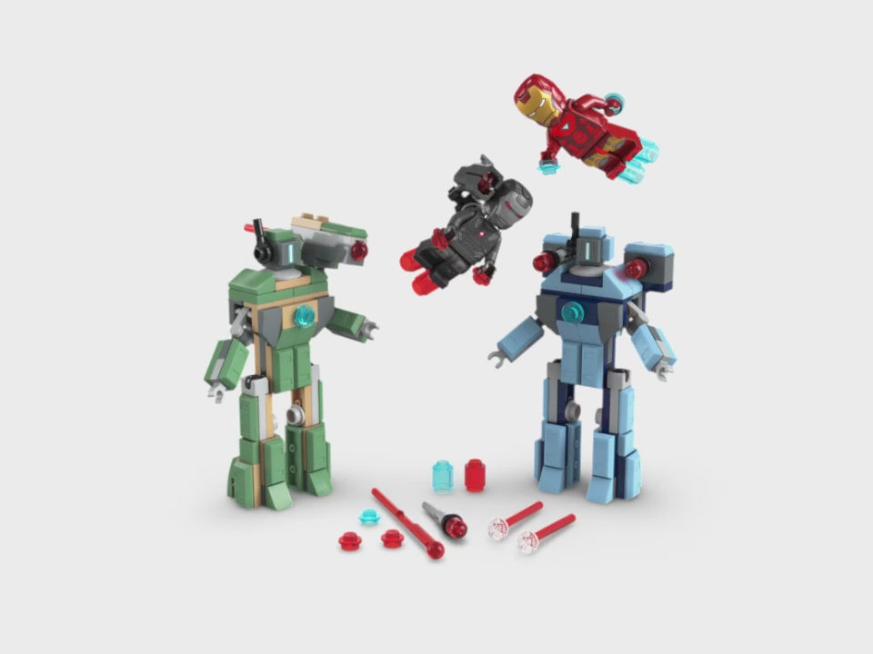 - Minifiguras LEGO® | Marvel: Una minifigura de Iron Man con blásteres azules en manos y pies, además de armas de rayos láser, y una minifigura de Máquina de Guerra equipada con blásteres rojos en manos y pies, así como con un cañón que dispara