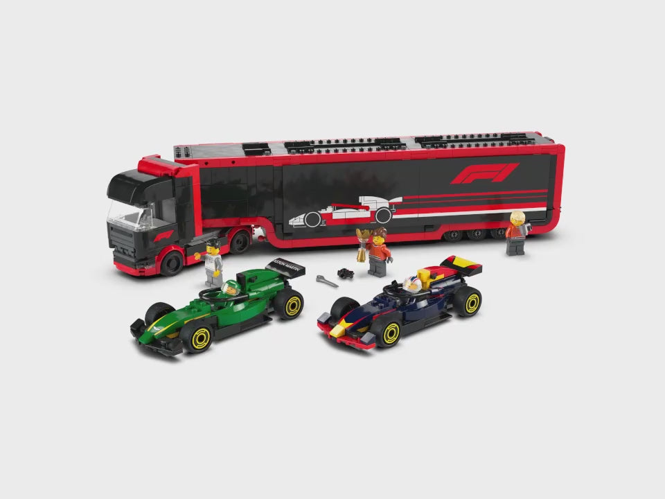 - ¿Qué contiene la caja? Todo lo necesario para construir un camión de transporte de F1® de juguete LEGO® con remolque de perfil bajo y aerodinámico, 2 autos de carreras de Formula 1® y minifiguras de 2 pilotos y 3 miembros del equipo, más un trofeo