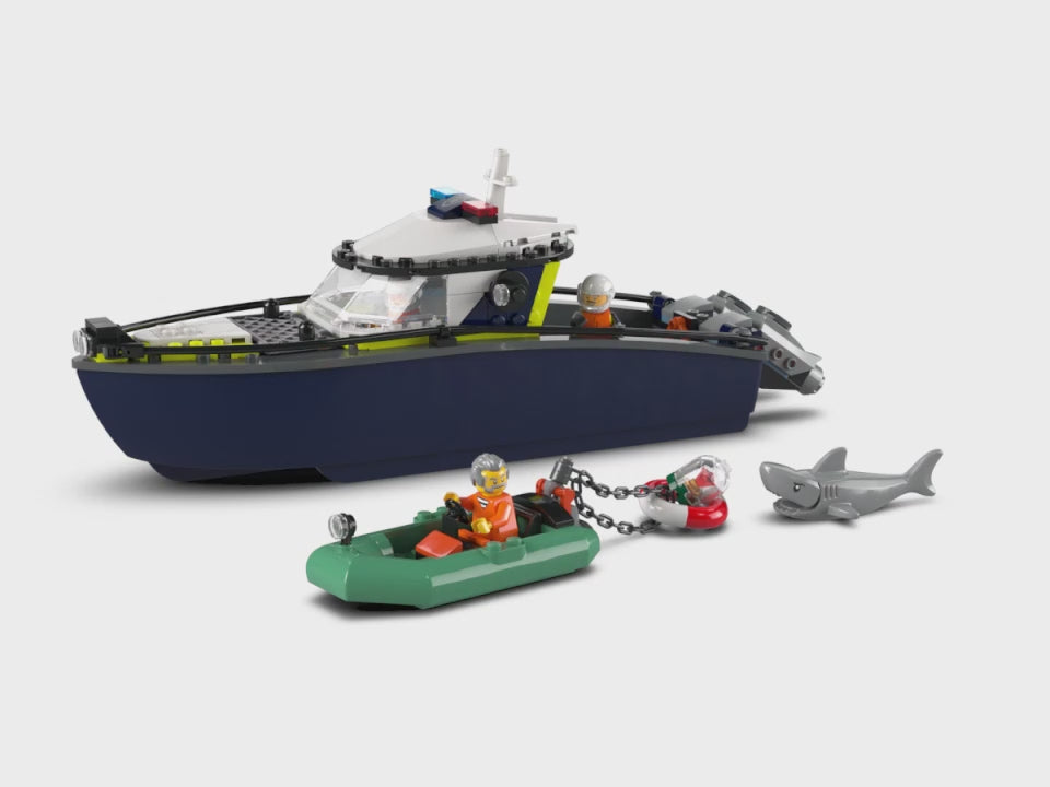 - ¿Qué contiene la caja? Todo lo necesario para que los peques construyan un barco de policía de juguete y el potente bote neumático de un ladrón, además de 2 minifiguras de agentes de policía, una minifigura de un ladrón y una figura de un tiburón
