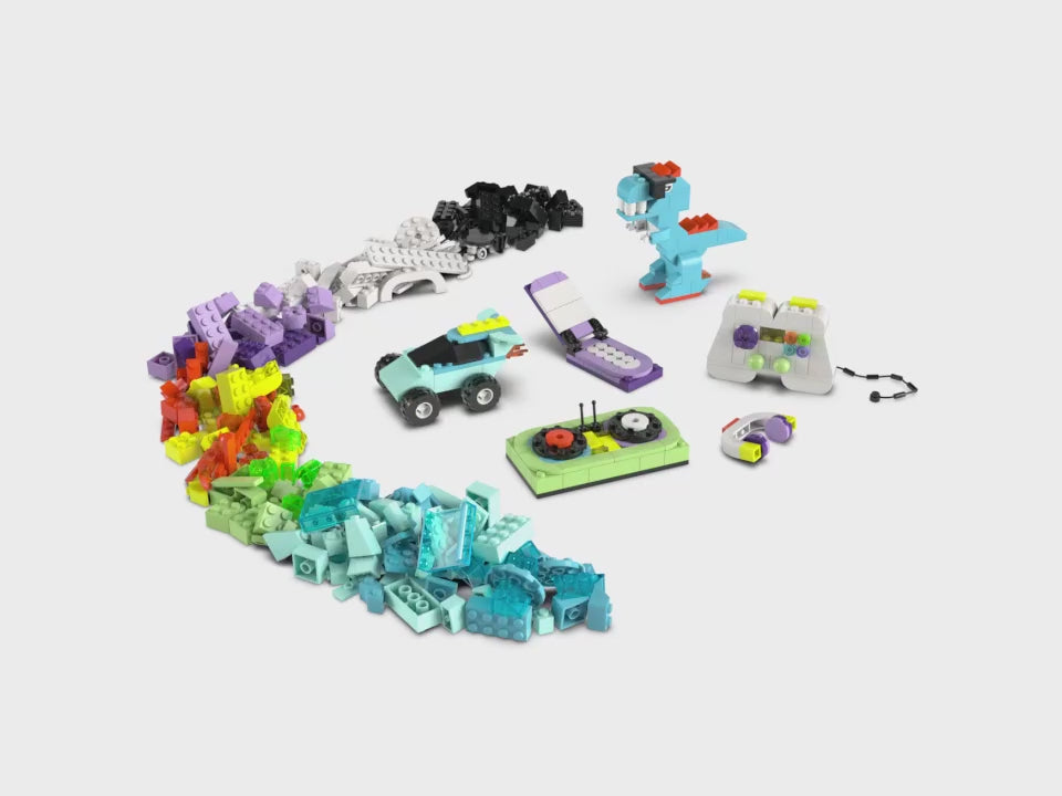 - Set de construcción creativa: Da forma a un mando de videojuegos, un dinosaurio con gafas, un teléfono móvil que se abre y se cierra, un monopatín, un camión monstruo, un equipo de DJ con auriculares y más juguetes construibles