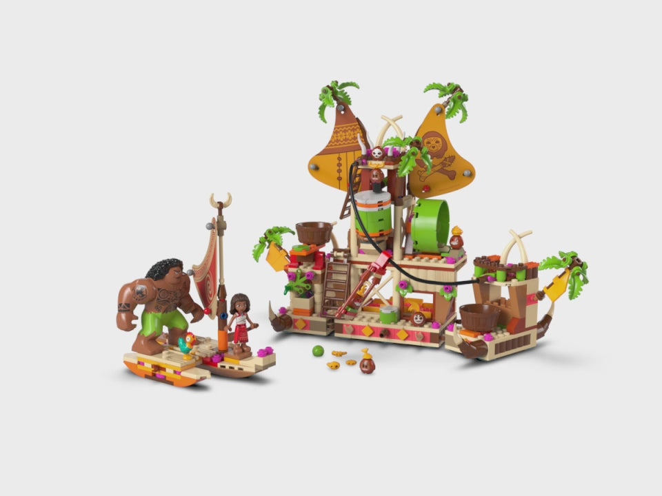 - Set de construcción Moana: Incluye una impresionante barcaza con 3 secciones y una tirolesa para vivir momentos llenos de emoción. También cuenta con una canoa más pequeña y personajes LEGO® | Disney como el gallo Heihei, Moana, Maui, Kotu y 5 más