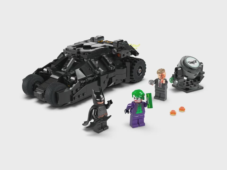 El set Tumbler de Batman™ vs. Two-Face™ y The Joker™ (76303) es un divertido juguete para pequeños apasionados de Batman, los vehículos, el poder creativo de LEGO® y las aventuras de superhéroes. Pon la acción sobre ruedas de Batman en las manos de tu joven superhéroe o superheroína de 8 años o más con este set LEGO de alta calidad que incluye el emblemático Batmóvil Tumbler de la trilogía clásica El caballero oscuro. Este juego LEGO Batman viene con 3 populares minifiguras: Batman (armado con su Batarang™), The Joker (sosteniendo un fajo de billetes) y Two-Face (con su característica moneda de plata). Abre el Batmóvil Tumbler y descubre un cuadro de mandos y un habitáculo con espacio para Batman. Del tubo de escape sale un elemento extraíble que representa una llama. La Batseñal (no se ilumina) se inclina y gira 360° en ambas direcciones. Para disfrutar también de diversión digital, los constructores pueden acercar y girar versiones 3D de sus modelos en la intuitiva app LEGO Builder.
