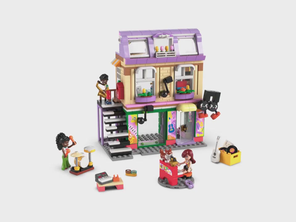 - Un set de construcción ideal como regalo para amantes de la música: El set LEGO® Friends Tienda de Música y Apartamento cuenta con montones de accesorios inspirados en la música, como una batería, un piano, una guitarra, un saxofón y más