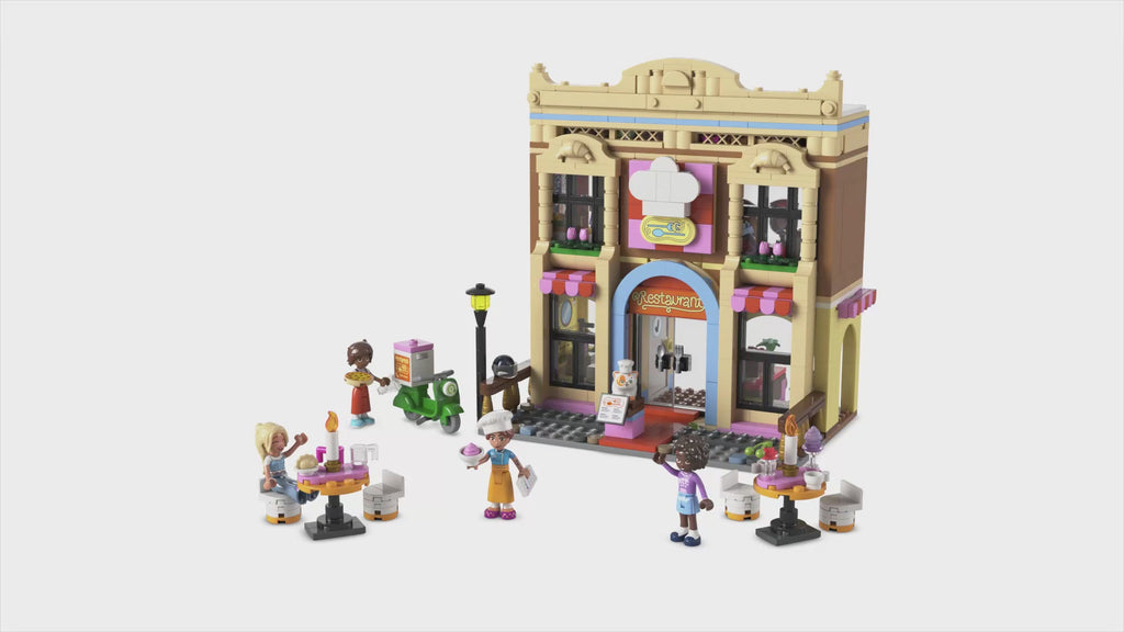 Los ratos de juego de las niñas y los niños a partir de 8 años se convierten en una aventura gastronómica mientras inventan sabrosos platillos en el set LEGO® Friends Restaurante y Escuela de Cocina (42655). Incluye un edificio de 2 pisos con cocina y terraza, además de 4 minipersonajes y una figura de un gato. El set es un gran regalo de cumpleaños para fans del juego creativo. Tu joven chef puede ayudar a Leo y la Chef Marta a desarrollar nuevas recetas. El restaurante y la escuela de cocina de juguete vienen con elementos que representan ingredientes y que los peques pueden combinar para crear sus propias preparaciones, así como con una cocina y utensilios. A la hora de abrir, el gato Churro, con gorro de chef, da la bienvenida a los clientes. Leo se ocupa de tomar las órdenes y de servir. ¿Gustará la comida? Sara y Aliya tienen caras alternativas para mostrar su reacción cuando prueban los platillos. También hay un cuarto de limpieza, un baño y una motoneta para repartir pedidos.