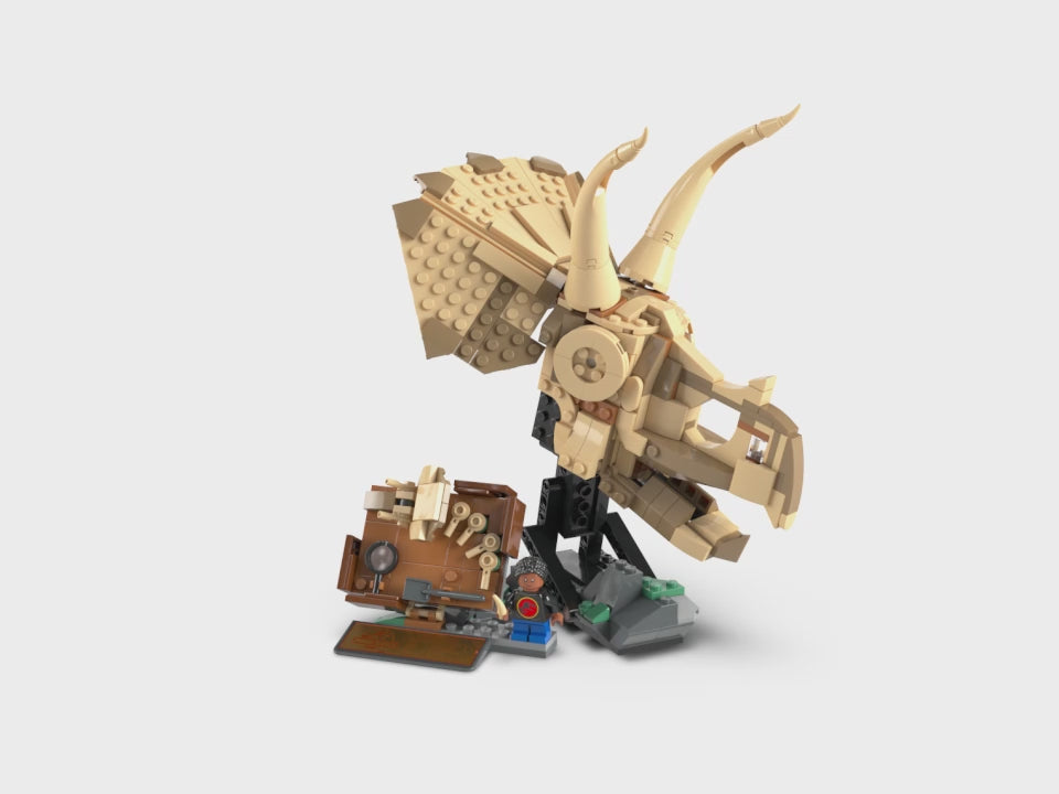 - Cráneo articulado de Triceratops con mandíbula que se abre: Este cráneo de juguete para niños puede colocarse con la mandíbula abierta o cerrada, bien sobre la base o junto a la minifigura, el lugar de excavación, los minifósiles y las herramientas