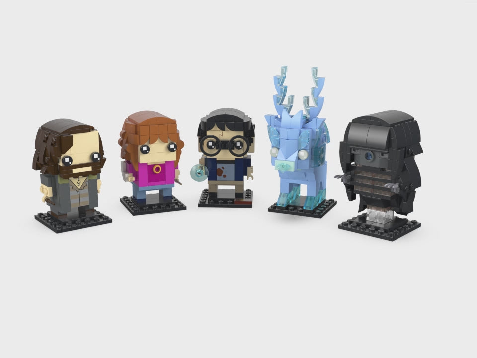 - Diseñados como piezas de exposición: Cada personaje LEGO® BrickHeadz™ construible mide aproximadamente 8 cm de altura (con la base); las figuras de Harry Potter™, Hermione Granger™ y Sirius Black™ traen sus respectivas varitas