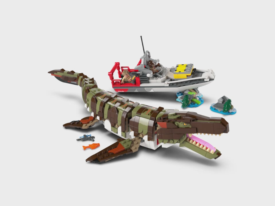 - Figura de acción de un dinosaurio y más: Una figura construible de un Mosasaurus con cuerpo articulado y un barco de juguete con un rastreador de dinosaurios, además de minifiguras de LeClerc y Atwater para interpretar historias