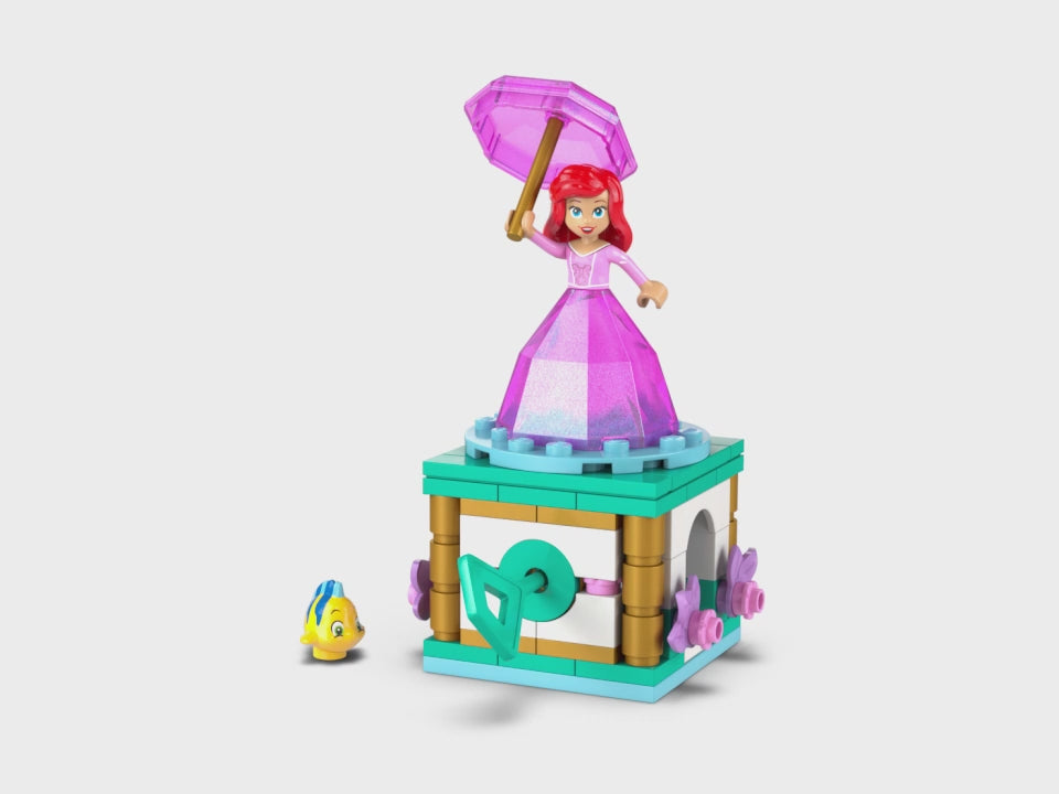 - Un encantador juguete para construir: Gira la llave de la base para que el disco dé vueltas y Ariel baile; después, guarda el minipersonaje LEGO® | Disney dentro del vestido “diamante” con el quitasol como tapa